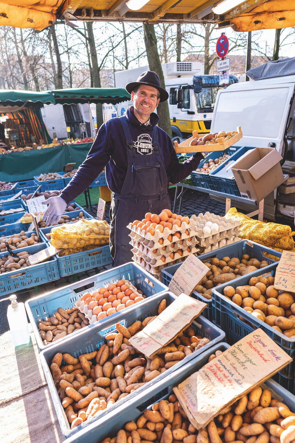 Seit einigen Monaten ist der Stand umgezogen: „Das war eine goldrichtige Entscheidung!“, freut sich Peter Holkenbrink, der neben den Kartoffeln auch andere Gemüse, Eier und Co. anbietet. Der Vater von zwei Söhnen schätzt seinen neuen „Superstandort“ direkt in der ersten Reihe hinter den Prinzipalmarkthäusern. „Ich bin ein Gefühlsmensch und liebe es, wenn die Sonne auf die Auslagen leuchtet und durch den Schatten der Linden bricht“, kommt Holkenbrink ins Schwärmen. Und wer weiß, vielleicht ist diese Begeisterungsfähigkeit ja auch schon „übergeschwappt“ auf die nächste Generation? Filius Leon, 15, ist jedenfalls schon in die Wachtelzucht eingestiegen, hegt und pflegt seine 12 Hennen und verdient sich mit dem Verkauf der Eier sein Taschengeld an Papas Stand.