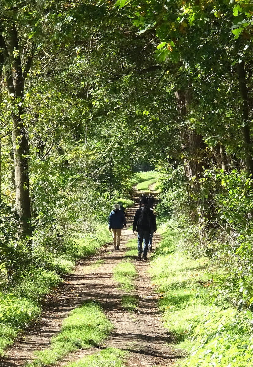 Unterhalb des Turms führt der Steig deutlich bergab und zweigt kurz vor tiefen Gräben auf beiden Seiten der Route nach rechts ab. Der Querweg führt uns nach links zu einer Kreuzung und von dort geradeaus „Im Höltken“ zur Biologischen Station (7, siehe unten). Dahinter zweigt vom Asphalt direkt nach Eintritt in den Wald der Steig nach links, vor der Lichtung rechts und dann wieder links ab. Der oft sehr morastige Weg führt schließlich nach einer S-Kurve auf einen breiten Querweg, der rechts an einer Wiese und dann links an einem Feld vorbeiführt. Direkt dahinter biegen wir rechts ab und gelangen schließlich zu der kleinen Straße, die uns nach links zur Landstraße bringt. Dieser folgen wir auf dem Radweg nach rechts bis zum Etappenziel, dem Haltepunkt Lembeck (8).